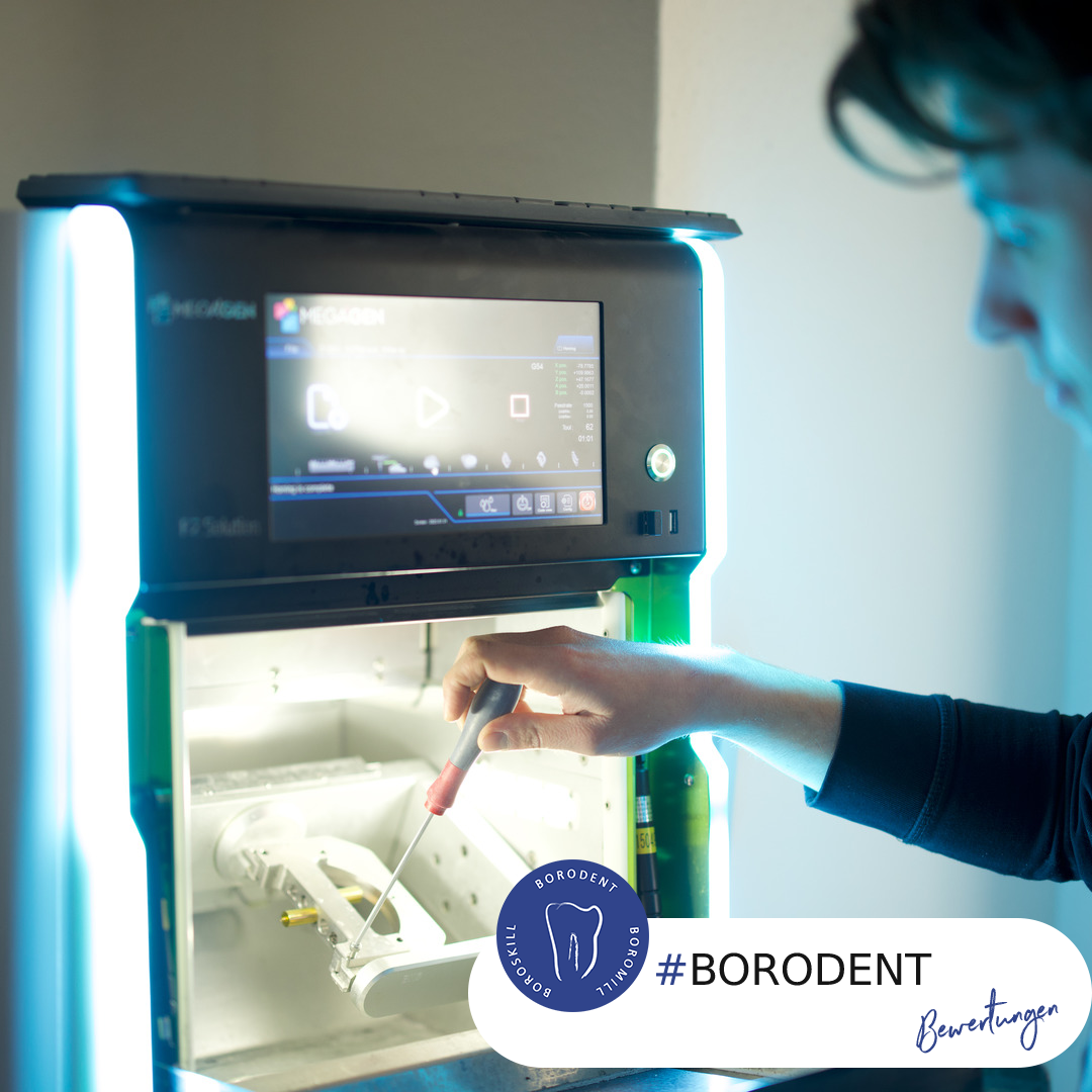 Ein Blick in unserem Fräszentrum Boromill. Hier sehen Sie die Bestückung der BX5 mit Titan-premills. Unsere Abutments sind ausschließlich individuell gefertigt.
